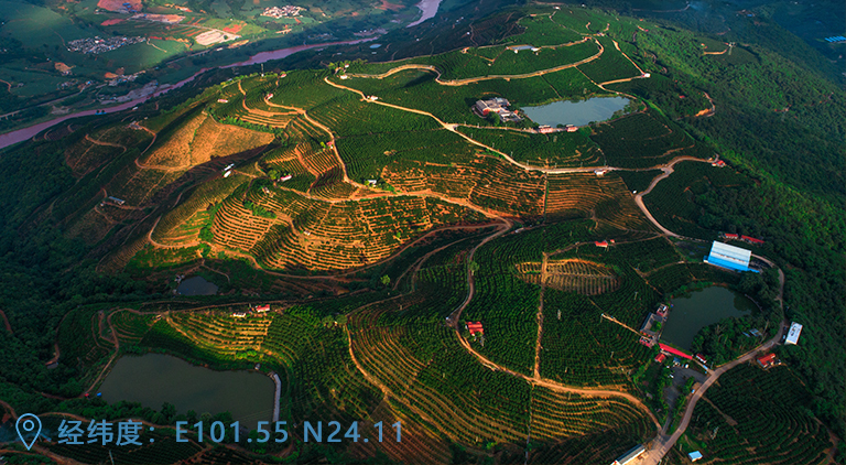 哀牢山中段东麓,6300亩, 海拔800~900米,年平均气温21~23℃, 年积温≥7500℃,年降雨量700~900㎜, 年日照时数为1800~2200小时, 南亚热带过度的干热河谷地带,森林覆盖面广, 哀牢山泉水,光、温度、水充足,环境优美,空气清新,“天然温室” |